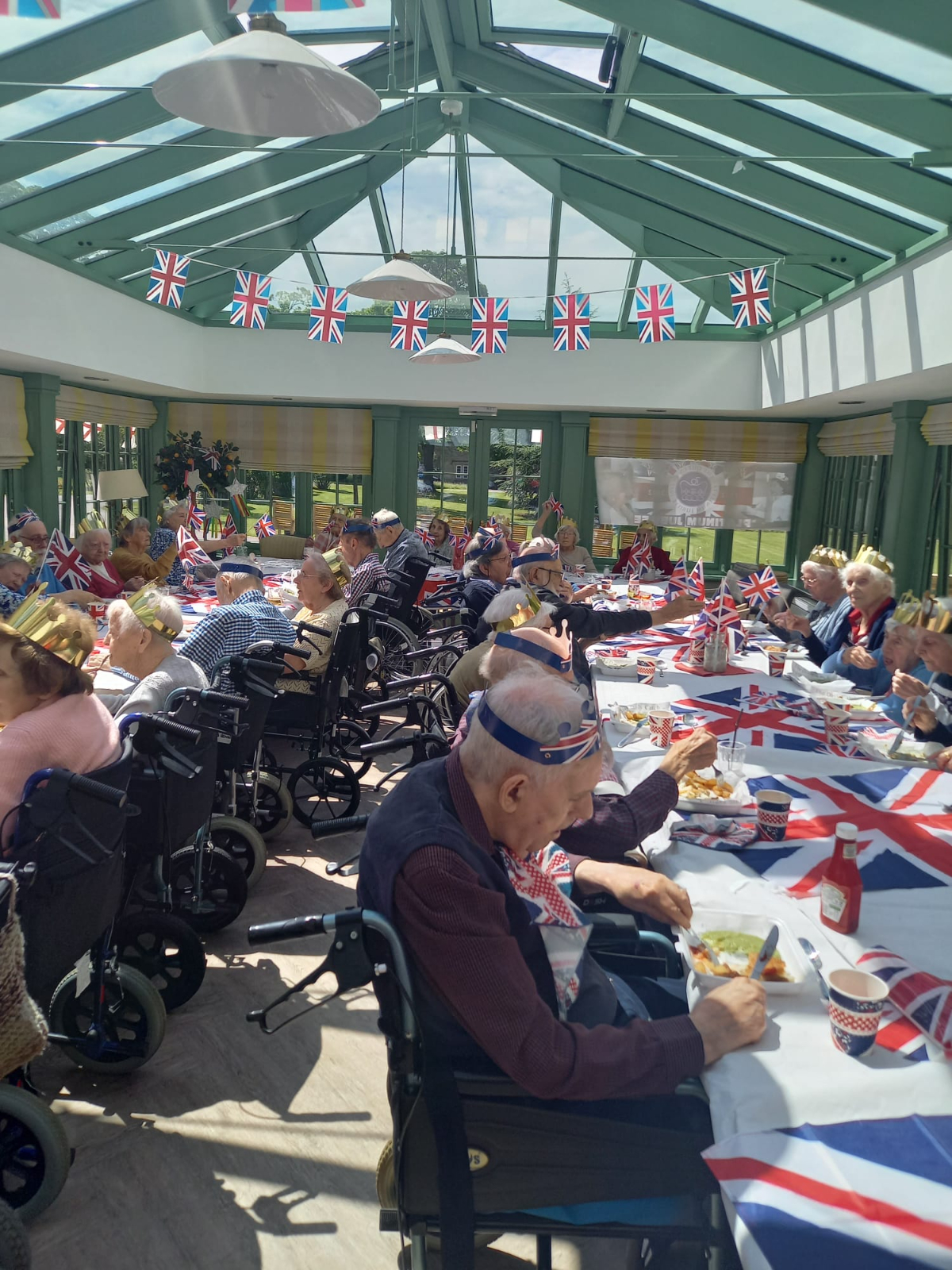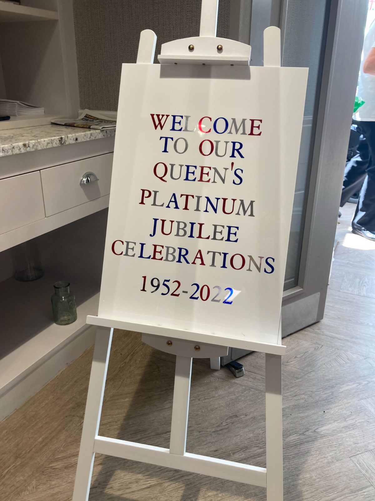 On Friday 3rd June, a ‘street party‘ was held in the conservatory. All residents were welcomed with flags, red and blue mocktails and 50s music. Traditional Fish and Chips were served ‘in the paper’ and residents reminisced about the Queen’s time on the throne.